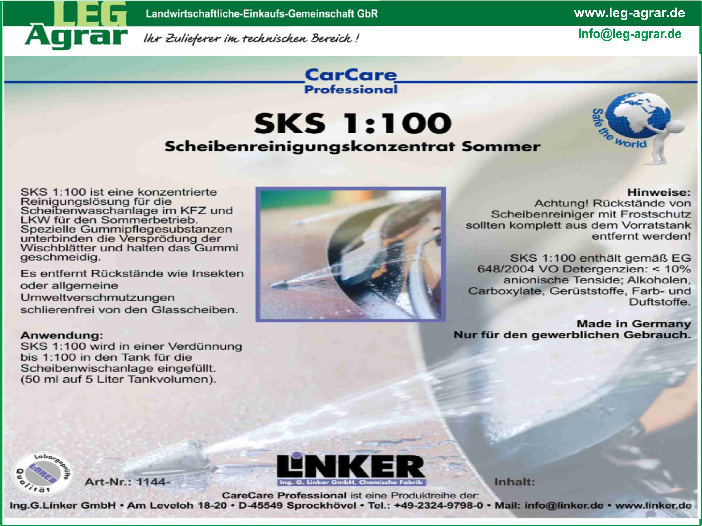 SKS 1:100 ist eine konzentrierte Reinigungslösung für die Scheibenwaschanlage im KFZ und LKW für den Sommerbetrieb. Spezielle Gummipflegesubstanzen unterbinden die Versprödung der Wischblätter und halten das Gummi geschmeidig.